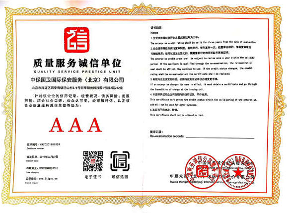 中保國衛(wèi)國際保安服務(北京)有限公司,屬中保國衛(wèi)集團旗下子公司。能全方位的為大型客戶提供優(yōu)質的安保、押運服務,是集人防和技防于一體的新型正規(guī)化綜合安保押運服務企業(yè),提供人防、物防、技防、聯網報*、非武裝押運等安防相關的一站式服務。 公司在國內多省設立有分公司及分支機構,著重提升安全押運、智能技術押運及安全技術防范相關的服務,業(yè)務范圍覆蓋全國一、二線城市、港澳地區(qū)以及海外地區(qū)。安保方面主要為政府機構、金融機構、企事業(yè)單位、醫(yī)療衛(wèi)生、高等院校、工業(yè)園區(qū)、大型商場、高檔住宅、智能商務樓、大型活動提供門衛(wèi)、守護、巡邏、押運(非武裝)、安全檢查、保安特勤、私人護衛(wèi)、消防中控、安全技術防范、遠洋護航等全方位服務,同時面向國際市場,為中資企業(yè)在“一帶一路”沿線國家投資提供境外安保服務。 >> 更多內容 |